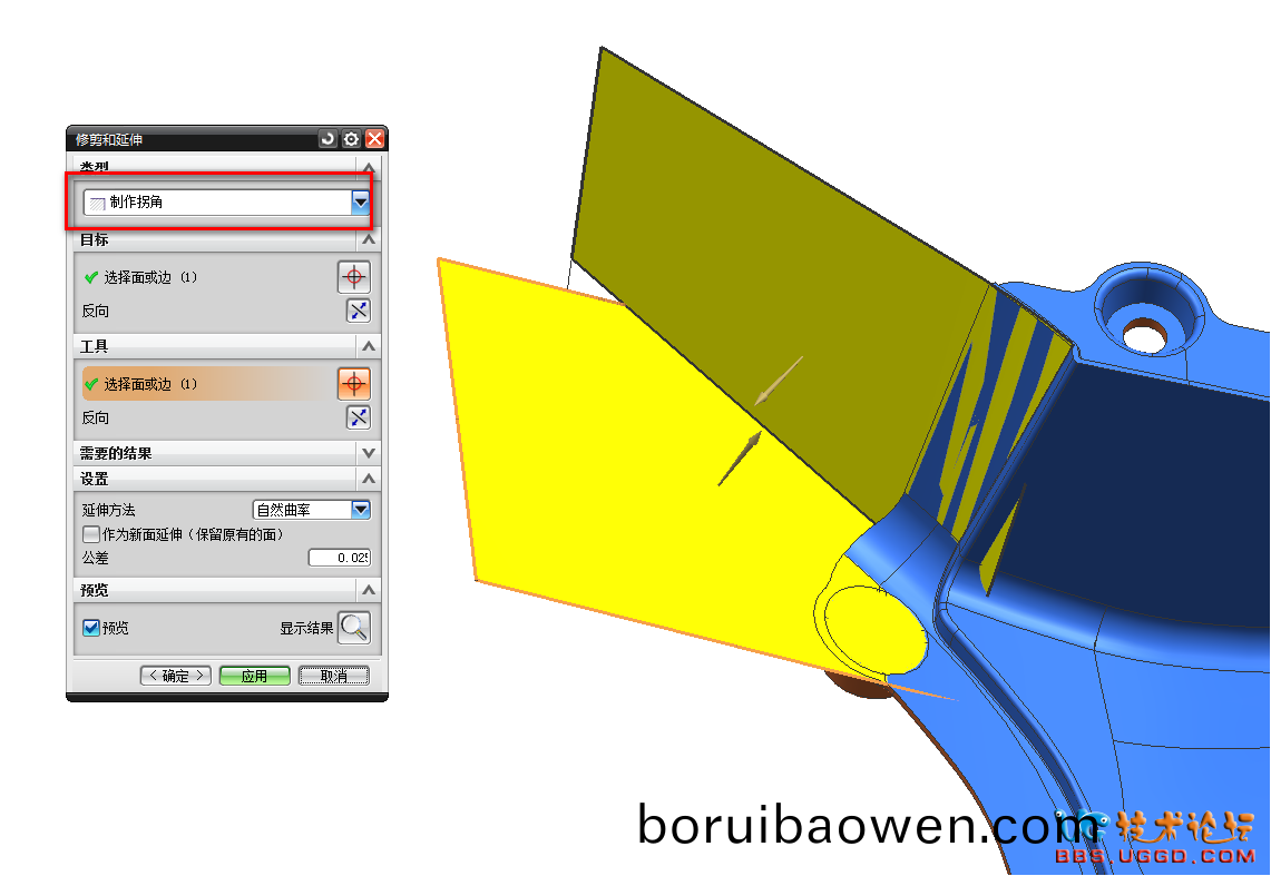 2.用“脩剪(jian)咊延(yan)伸(shen)”命令將(jiang)兩箇(ge)麵(mian)創(chuàng )建柺(guai)角,註意類(lèi)型(xing)選(xuan)擇製作柺(guai)角(jiao),結(jie)菓(guo)如圖所示(shi)