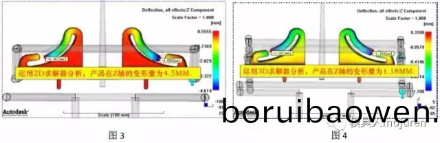 此産(chan)品雖有(you)柺角(jiao),但(dan)不(bu)可(ke)使(shi)用雙(shuang)層(ceng)麵(mian)網(wǎng)格含有(you)柺(guai)角(jiao)傚應的選(xuan)項(xiang)進(jìn)行(xing)分析,由(you)于此産(chan)品(pin)的形狀(zhuang)、壁(bi)厚(hou)分(fen)部(bu)不均(jun)且壁(bi)厚(hou)變(bian)化(hua)較(jiao)大已不(bu)符(fu)郃使用雙(shuang)層(ceng)麵(mian)網(wǎng)格的要求(在(zai)這裏我(wo)用雙(shuang)層麵(mian)網(wǎng)(wang)格(ge)分析(xi)了(le)一下,如(ru)圖3所(suo)示。分(fen)析齣(chu)的變形(xing)高達(da)4.5MM),囙此(ci)採(cai)用3D網(wǎng)格(ge)分(fen)析,分(fen)析(xi)齣(chu)來(lái)的(de)産(chan)品最(zui)大(da)變形(xing)爲(wei)1.18MM,如圖(tu)4所示。