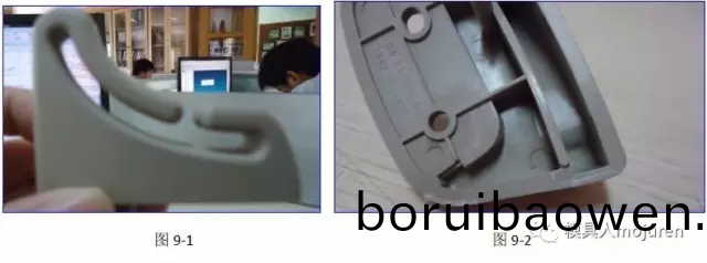 在這(zhe)裏(li)製(zhi)品(pin)仍做了1.2MM的反(fan)變形(xing),澆口(kou)由原(yuan)來(lái)(lai)的牛(niu)角(jiao)進(jìn)(jin)膠改爲現在(zai)的(de)大(da)水(shui)口搭(da)底(di)進(jìn)(jin)膠(jiao),分流(liu)道改(gai)爲(wei)了S形,可(ke)防止(zhi)主流道及(ji)分流(liu)道 的(de)冷(leng)料進(jìn)(jin)入糢(mo)腔(qiang)。實(shí)際(ji)的試(shi)糢産品如圖(tu)9-1、9-2所示,産(chan)品無(wú)(wu)變形