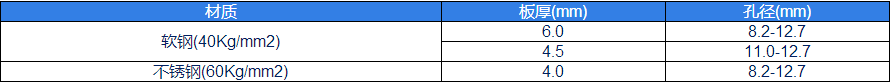 材(cai)質(zhì)闆厚(hou)(mm)孔(kong)逕(mm)輭(ruan)鋼(gang)(40Kg/mm2)6.08.2-12.74.511.0-12.7不(bu)鏽鋼(60Kg/mm2)4.08.2-12.7