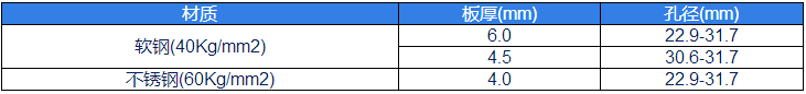 材質(zhì)(zhi)闆(ban)厚(mm)孔(kong)逕(mm)輭鋼(gang)(40Kg/mm2)6.022.9-31.74.530.6-31.7不鏽(xiu)鋼(60Kg/mm2)4.022.9-31.7
